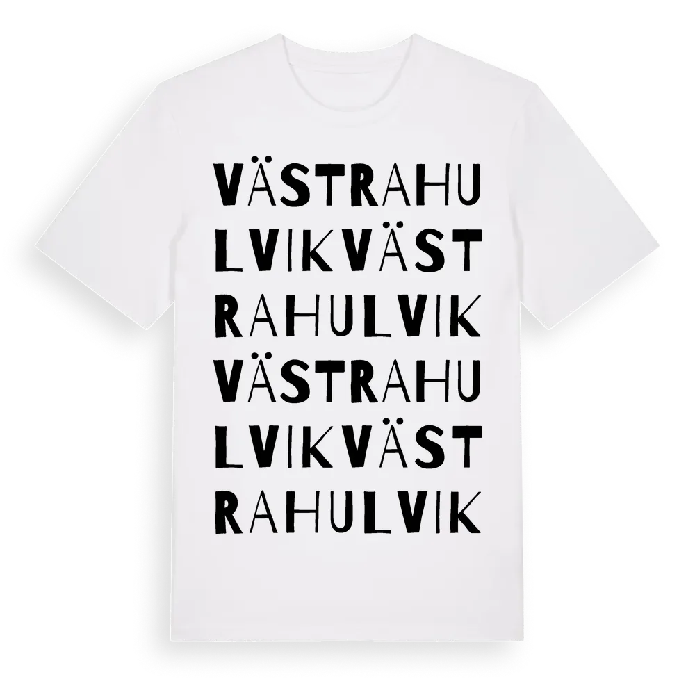 Västra Hulvik ordlek t-shirt är inspirerad av byn Västra Hulvik i Örebro län, Sverige. Tröjan är designad för dig som har en speciell koppling till platsen – oavsett om du bor här, har rötterna här eller bara älskar Västra Hulvik.