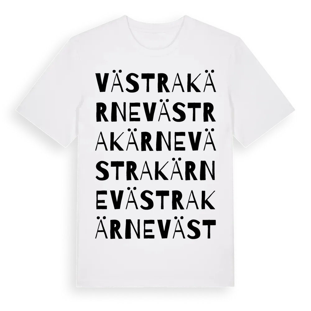 Västra Kärne ordlek t-shirt är inspirerad av Västra Kärne i Örebro län, Sverige. Tröjan är designad för dig som har en speciell koppling till platsen – oavsett om du bor här, har rötterna här eller bara älskar Västra Kärne.