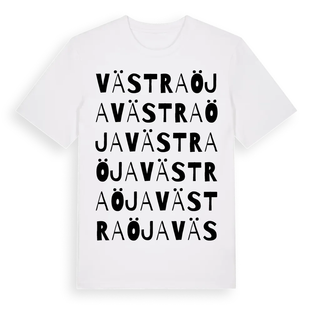 Västra Öja ordlek t-shirt är inspirerad av byn Västra Öja i Örebro län, Sverige. Tröjan är designad för dig som har en speciell koppling till platsen – oavsett om du bor här, har rötterna här eller bara älskar Västra Öja.