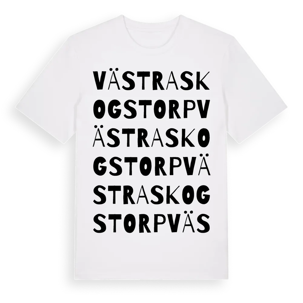 Västra Skogstorp ordlek t-shirt är inspirerad av byn Västra Skogstorp i Örebro län, Sverige. Tröjan är designad för dig som har en speciell koppling till platsen – oavsett om du bor här, har rötterna här eller bara älskar Västra Skogstorp.