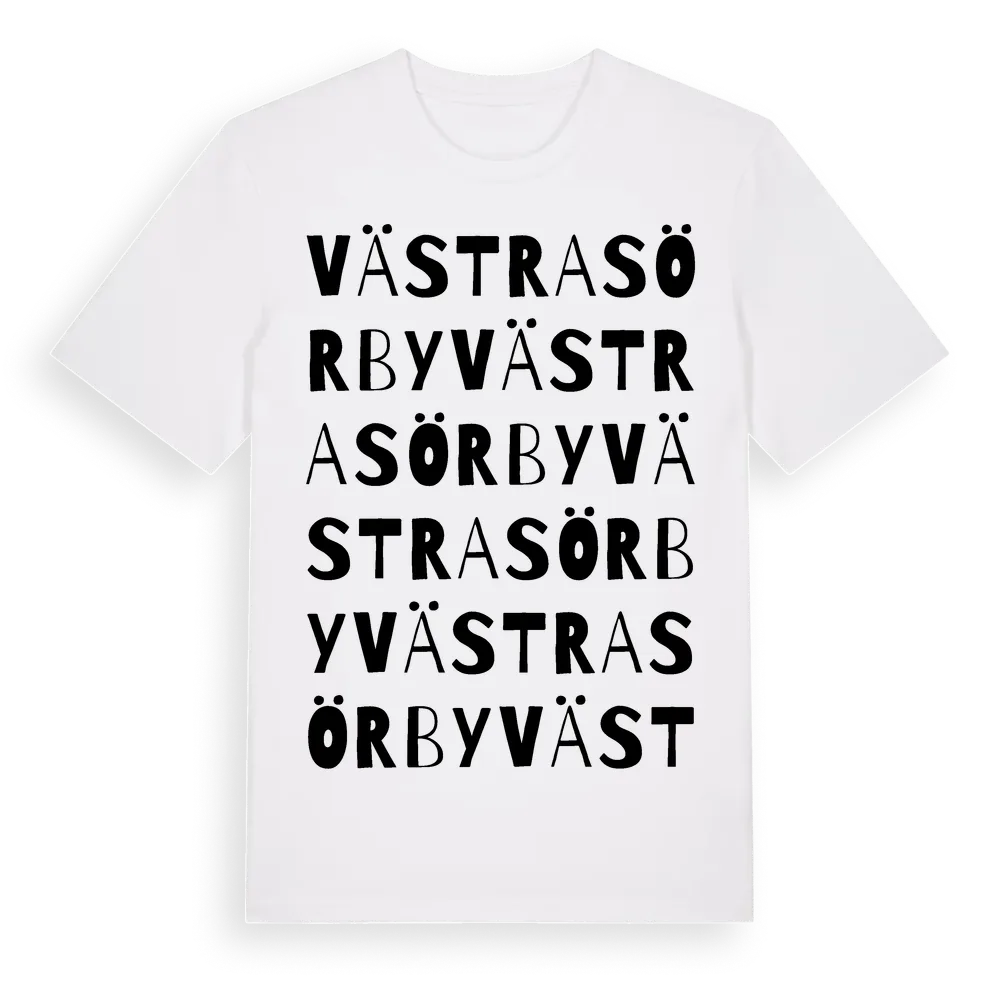 Västra Sörby ordlek t-shirt är inspirerad av byn Västra Sörby i Örebro län, Sverige. Tröjan är designad för dig som har en speciell koppling till platsen – oavsett om du bor här, har rötterna här eller bara älskar Västra Sörby.