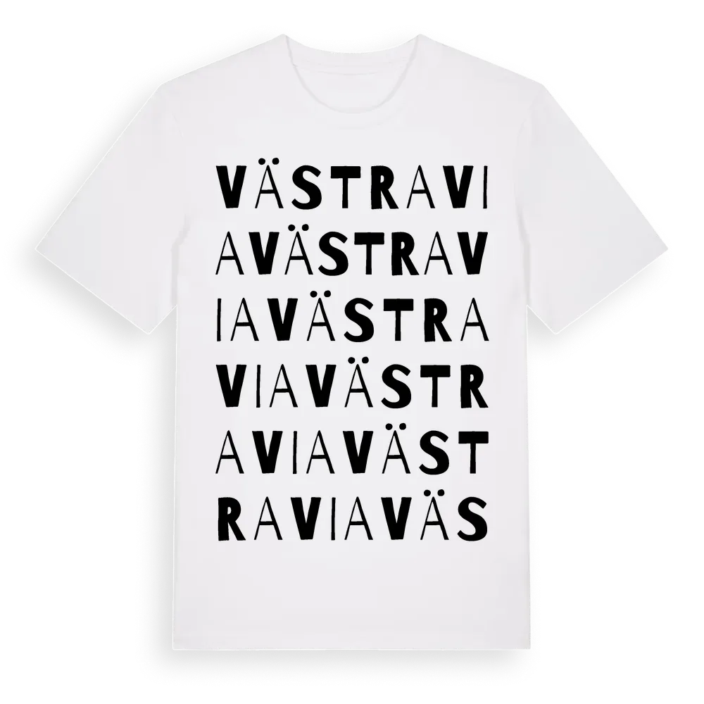 Västra Via ordlek t-shirt är inspirerad av byn Västra Via i Örebro län, Sverige. Tröjan är designad för dig som har en speciell koppling till platsen – oavsett om du bor här, har rötterna här eller bara älskar Västra Via.