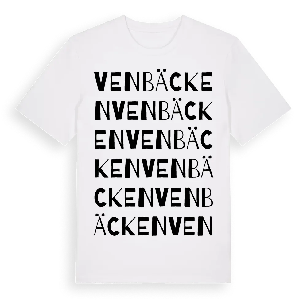 Venbäcken ordlek t-shirt är inspirerad av Venbäcken i Örebro län, Sverige. Tröjan är designad för dig som har en speciell koppling till platsen – oavsett om du bor här, har rötterna här eller bara älskar Venbäcken.