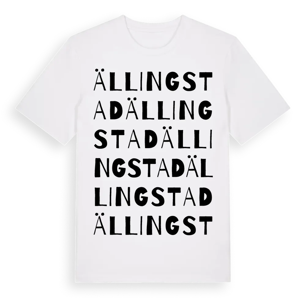 Ällingstad ordlek t-shirt är inspirerad av Ällingstad i Östergötlands län, Sverige. Tröjan är designad för dig som har en speciell koppling till platsen – oavsett om du bor här, har rötterna här eller bara älskar Ällingstad.