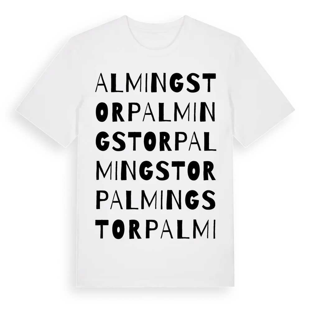 Almingstorp ordlek t-shirt är inspirerad av Almingstorp i Östergötlands län, Sverige. Tröjan är designad för dig som har en speciell koppling till platsen – oavsett om du bor här, har rötterna här eller bara älskar Almingstorp.