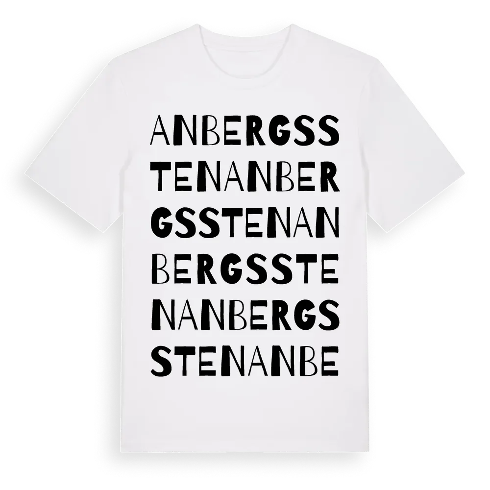 Anbergs Sten ordlek t-shirt är inspirerad av Anbergs Sten i Östergötlands län, Sverige. Tröjan är designad för dig som har en speciell koppling till platsen – oavsett om du bor här, har rötterna här eller bara älskar Anbergs Sten.