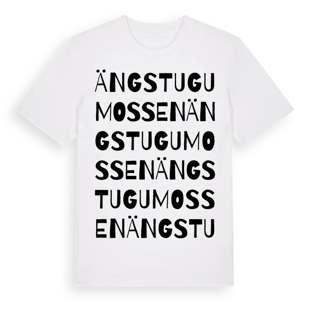 Ängstugumossen ordlek t-shirt är inspirerad av Ängstugumossen i Östergötlands län, Sverige. Tröjan är designad för dig som har en speciell koppling till platsen – oavsett om du bor här, har rötterna här eller bara älskar Ängstugumossen.