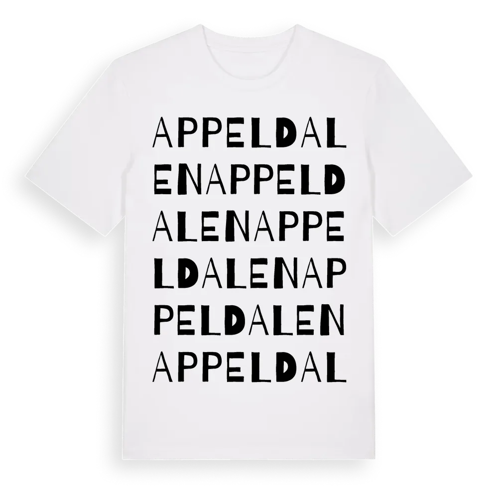 Appeldalen ordlek t-shirt är inspirerad av Appeldalen i Östergötlands län, Sverige. Tröjan är designad för dig som har en speciell koppling till platsen – oavsett om du bor här, har rötterna här eller bara älskar Appeldalen.