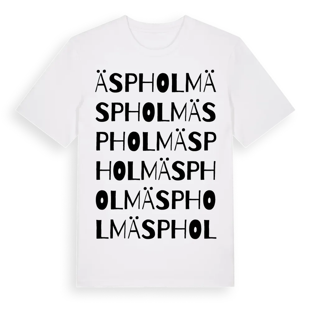 Äspholm ordlek t-shirt är inspirerad av ön Äspholm i Östergötlands län, Sverige. Tröjan är designad för dig som har en speciell koppling till platsen – oavsett om du bor här, har rötterna här eller bara älskar Äspholm.