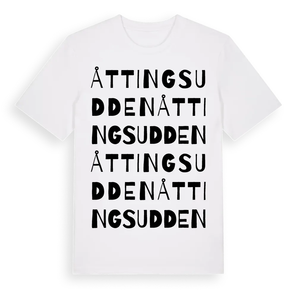 Åttingsudden ordlek t-shirt är inspirerad av Åttingsudden i Östergötlands län, Sverige. Tröjan är designad för dig som har en speciell koppling till platsen – oavsett om du bor här, har rötterna här eller bara älskar Åttingsudden.