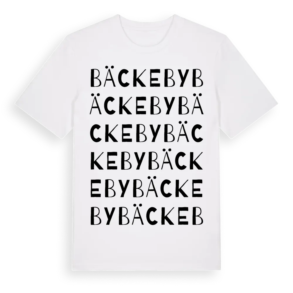 Bäckeby ordlek t-shirt är inspirerad av byn Bäckeby i Östergötlands län, Sverige. Tröjan är designad för dig som har en speciell koppling till platsen – oavsett om du bor här, har rötterna här eller bara älskar Bäckeby.