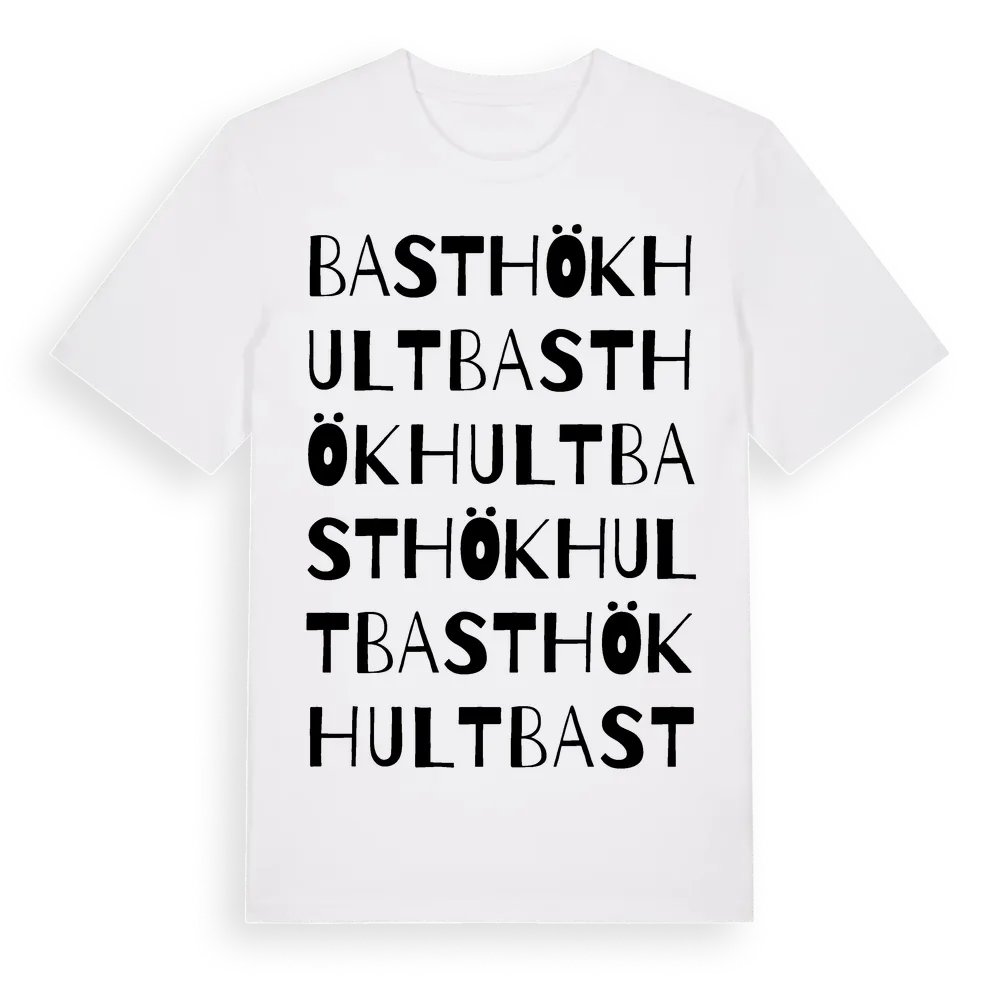 Basthökhult ordlek t-shirt är inspirerad av Basthökhult i Östergötlands län, Sverige. Tröjan är designad för dig som har en speciell koppling till platsen – oavsett om du bor här, har rötterna här eller bara älskar Basthökhult.