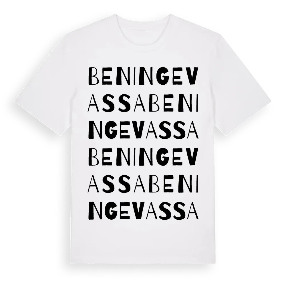 Beningevassa ordlek t-shirt är inspirerad av Beningevassa i Östergötlands län, Sverige. Tröjan är designad för dig som har en speciell koppling till platsen – oavsett om du bor här, har rötterna här eller bara älskar Beningevassa.