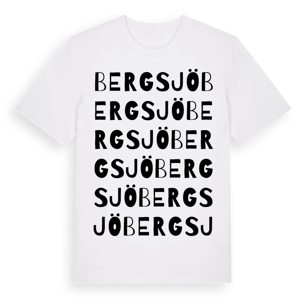 Bergsjö ordlek t-shirt är inspirerad av byn Bergsjö i Östergötlands län, Sverige. Tröjan är designad för dig som har en speciell koppling till platsen – oavsett om du bor här, har rötterna här eller bara älskar Bergsjö.