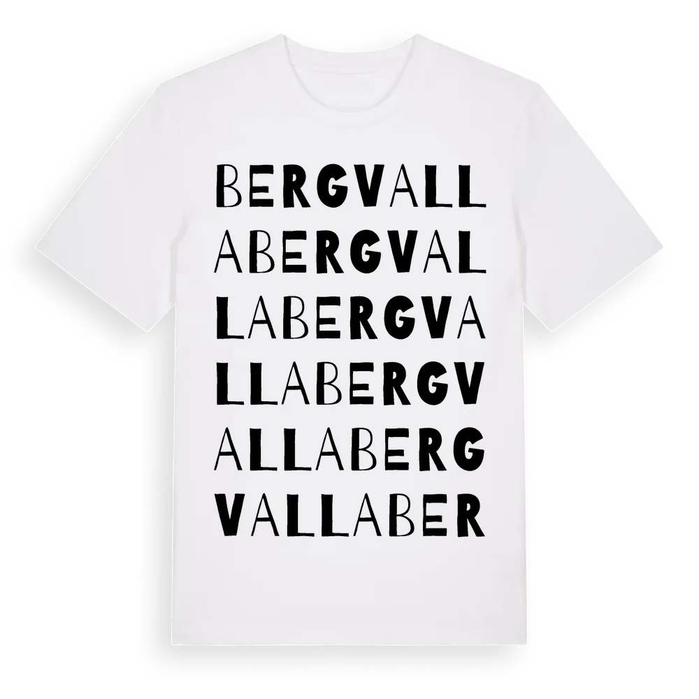 Bergvalla ordlek t-shirt är inspirerad av Bergvalla i Östergötlands län, Sverige. Tröjan är designad för dig som har en speciell koppling till platsen – oavsett om du bor här, har rötterna här eller bara älskar Bergvalla.