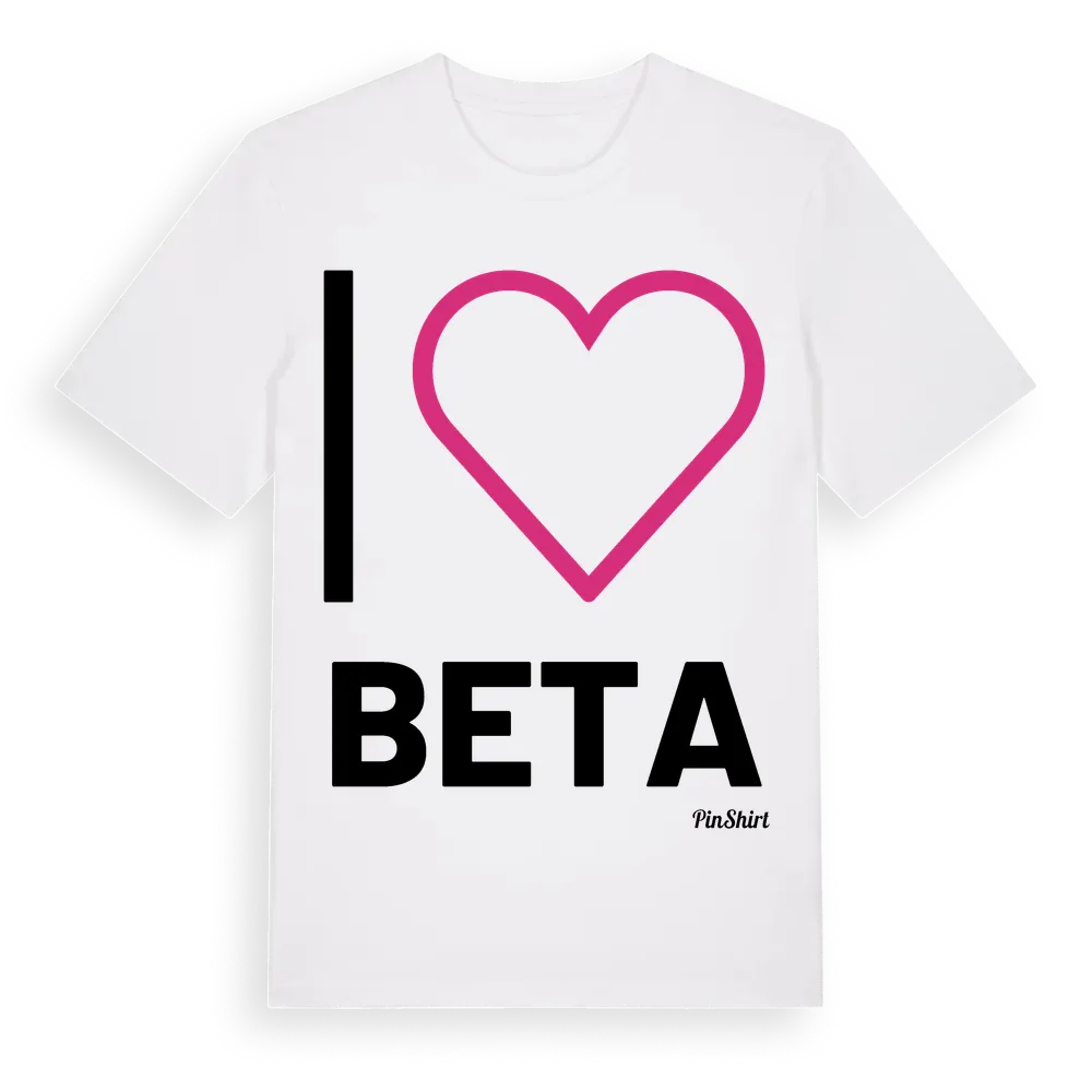 Det klassiska "I ❤ Beta"-motivet i stort format som täcker hela bröstet. För dig som vill visa kärleken till Beta på riktigt. Premium bomull, unisex – från byn Beta i Östergötlands län.