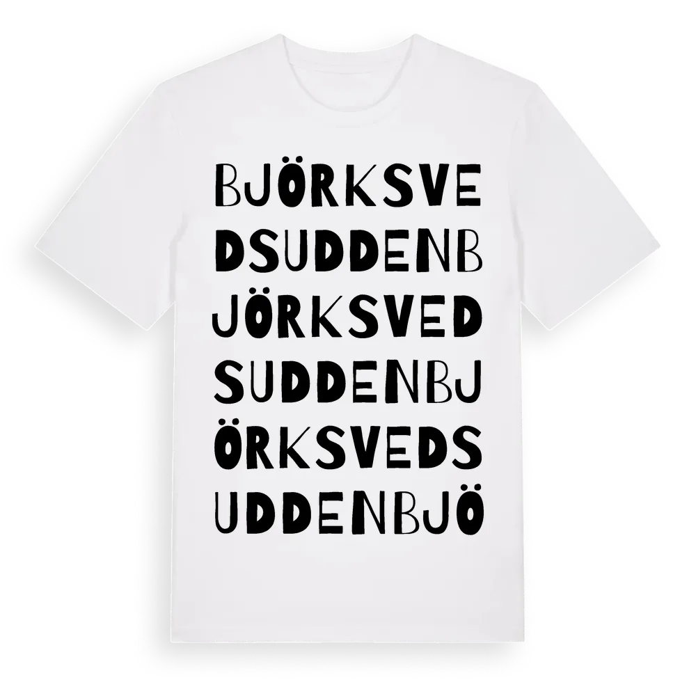 Björksvedsudden ordlek t-shirt är inspirerad av Björksvedsudden i Östergötlands län, Sverige. Tröjan är designad för dig som har en speciell koppling till platsen – oavsett om du bor här, har rötterna här eller bara älskar Björksvedsudden.