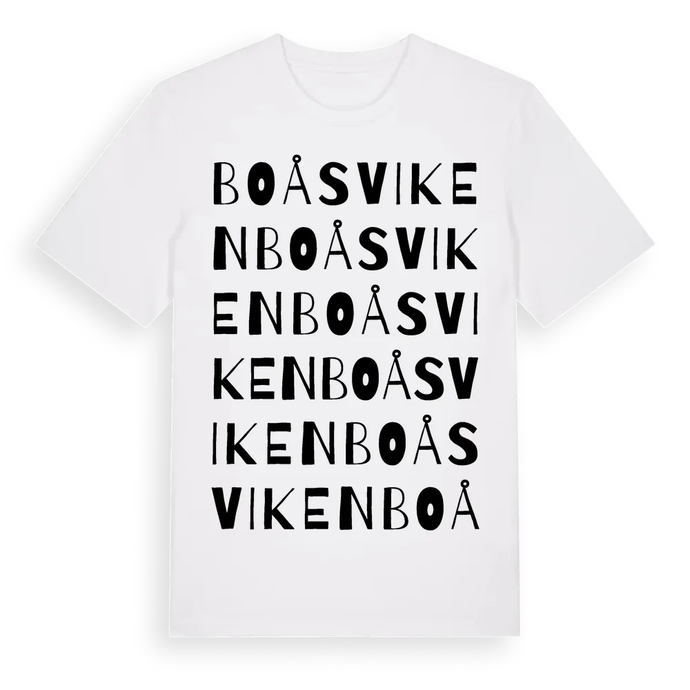 Boåsviken ordlek t-shirt är inspirerad av Boåsviken i Östergötlands län, Sverige. Tröjan är designad för dig som har en speciell koppling till platsen – oavsett om du bor här, har rötterna här eller bara älskar Boåsviken.