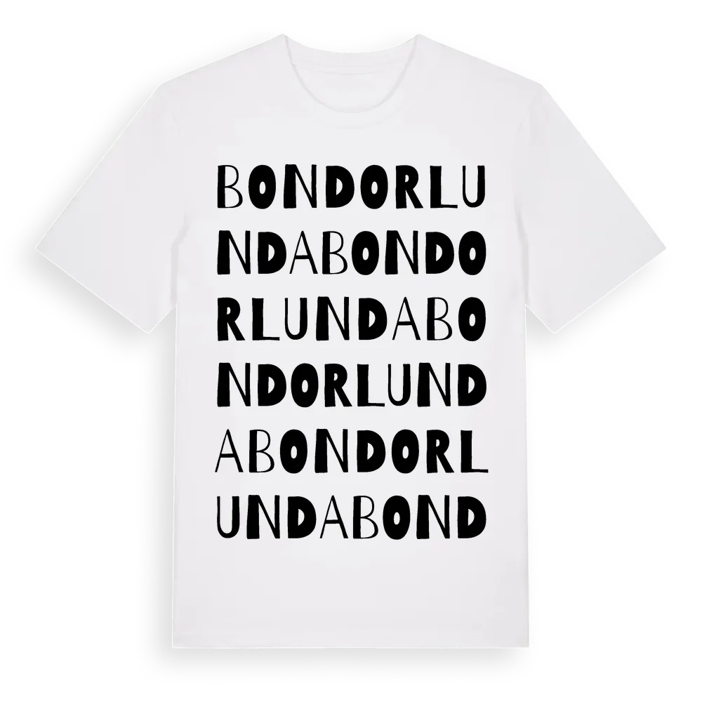 En ordlek byggd på Bondorlundas namn. Subtilt och klurig – ett motiv som bara de som verkligen känner platsen fullt ut förstår. Premium bomull, unisex – från byn Bondorlunda i Östergötlands län.