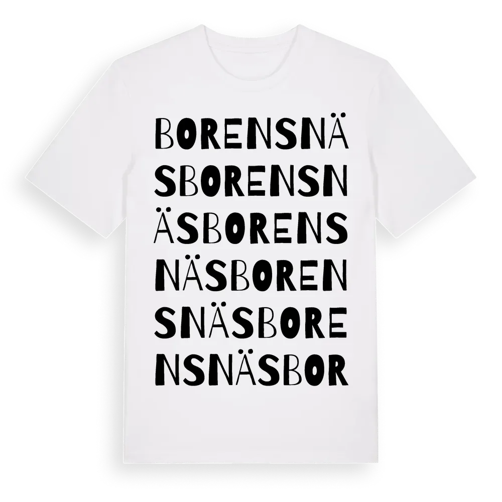Borensnäs ordlek t-shirt är inspirerad av byn Borensnäs i Östergötlands län, Sverige. Tröjan är designad för dig som har en speciell koppling till platsen – oavsett om du bor här, har rötterna här eller bara älskar Borensnäs.