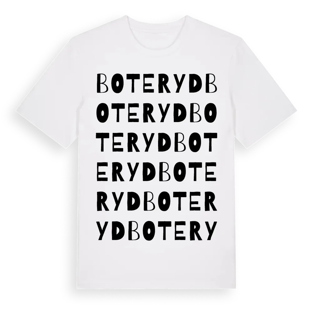 En ordlek byggd på Boteryds namn. Subtilt och klurig – ett motiv som bara de som verkligen känner platsen fullt ut förstår. Premium bomull, unisex – från Boteryd i Östergötlands län.