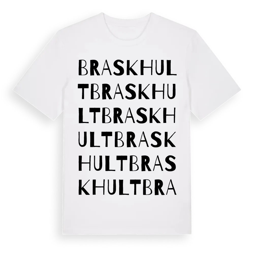 Braskhult ordlek t-shirt är inspirerad av byn Braskhult i Östergötlands län, Sverige. Tröjan är designad för dig som har en speciell koppling till platsen – oavsett om du bor här, har rötterna här eller bara älskar Braskhult.