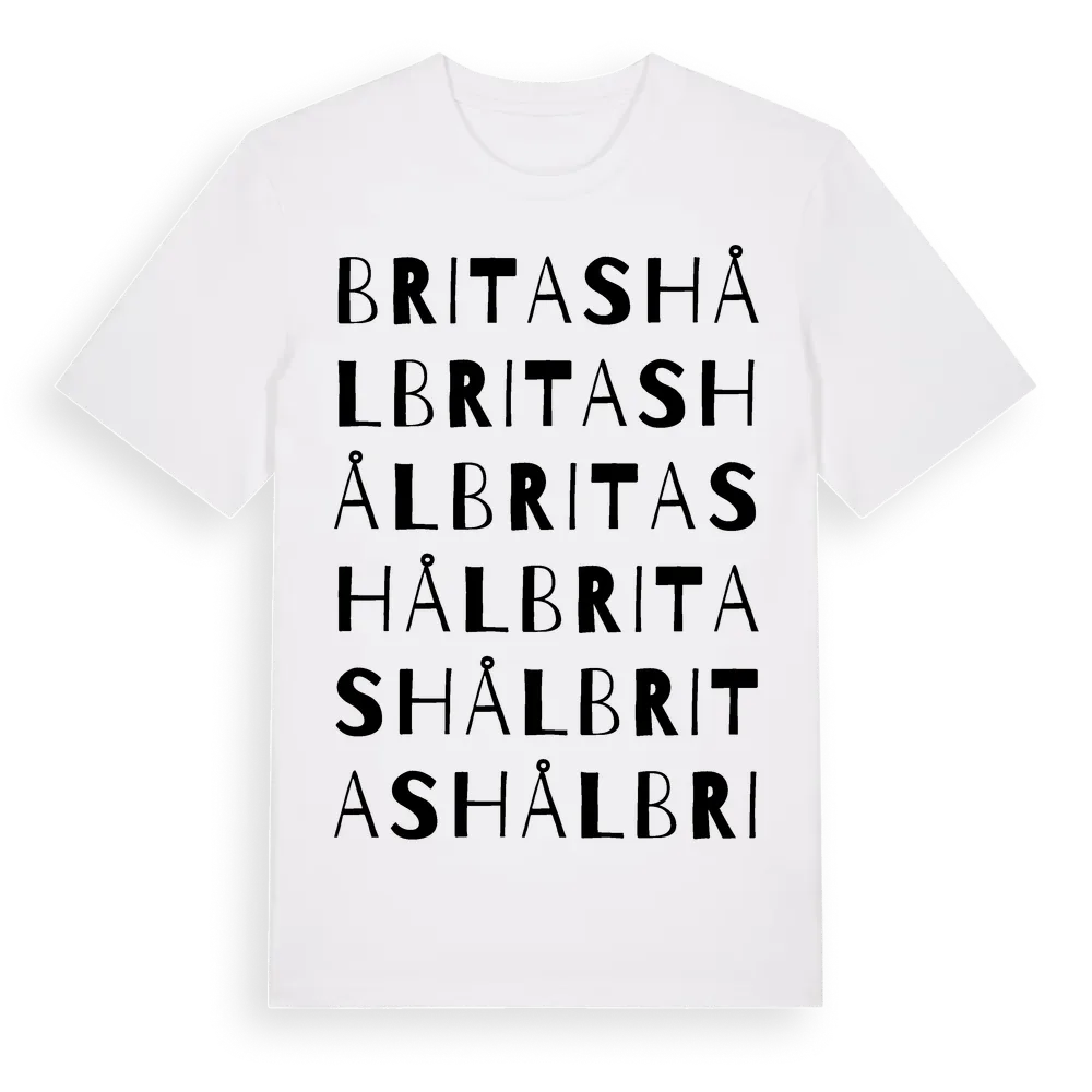 Britas Hål ordlek t-shirt är inspirerad av Britas Hål i Östergötlands län, Sverige. Tröjan är designad för dig som har en speciell koppling till platsen – oavsett om du bor här, har rötterna här eller bara älskar Britas Hål.