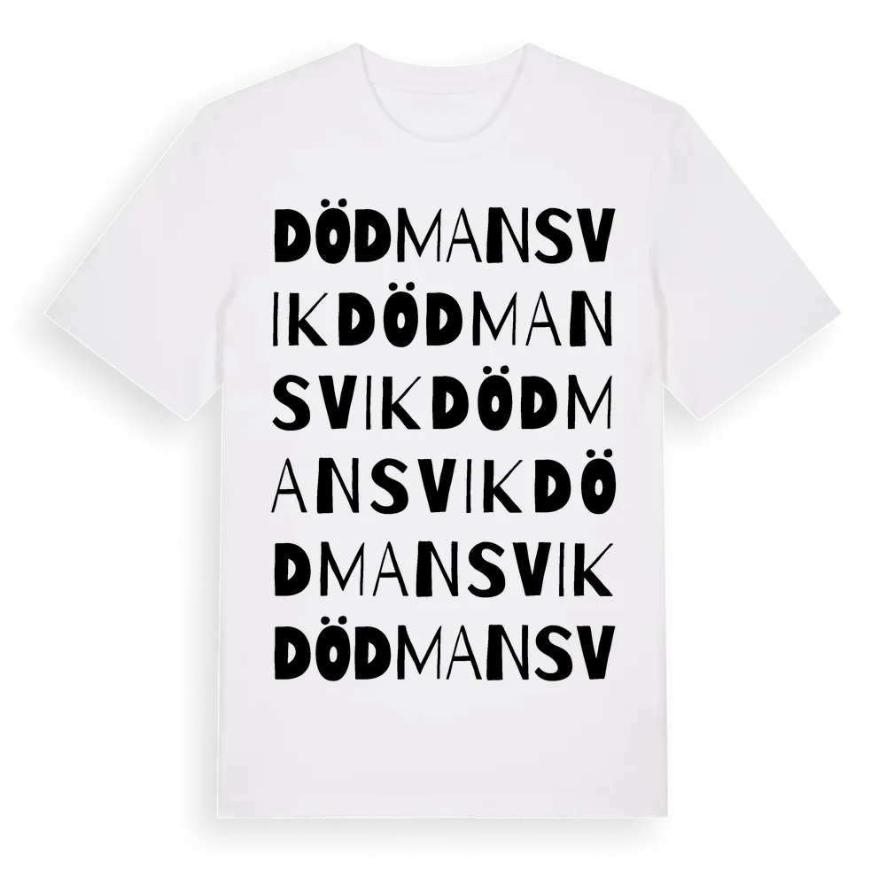 Dödmansvik ordlek t-shirt är inspirerad av Dödmansvik i Östergötlands län, Sverige. Tröjan är designad för dig som har en speciell koppling till platsen – oavsett om du bor här, har rötterna här eller bara älskar Dödmansvik.
