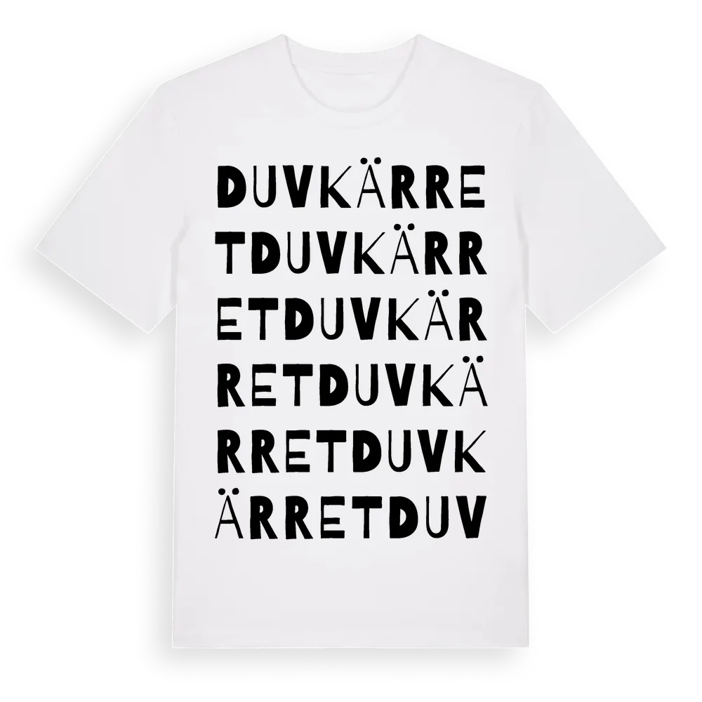 Duvkärret ordlek t-shirt är inspirerad av Duvkärret i Östergötlands län, Sverige. Tröjan är designad för dig som har en speciell koppling till platsen – oavsett om du bor här, har rötterna här eller bara älskar Duvkärret.