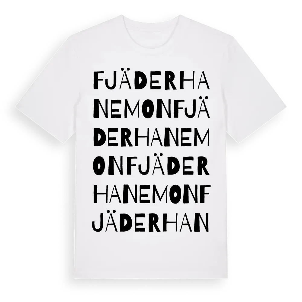 Fjäderhanemon ordlek t-shirt är inspirerad av Fjäderhanemon i Östergötlands län, Sverige. Tröjan är designad för dig som har en speciell koppling till platsen – oavsett om du bor här, har rötterna här eller bara älskar Fjäderhanemon.