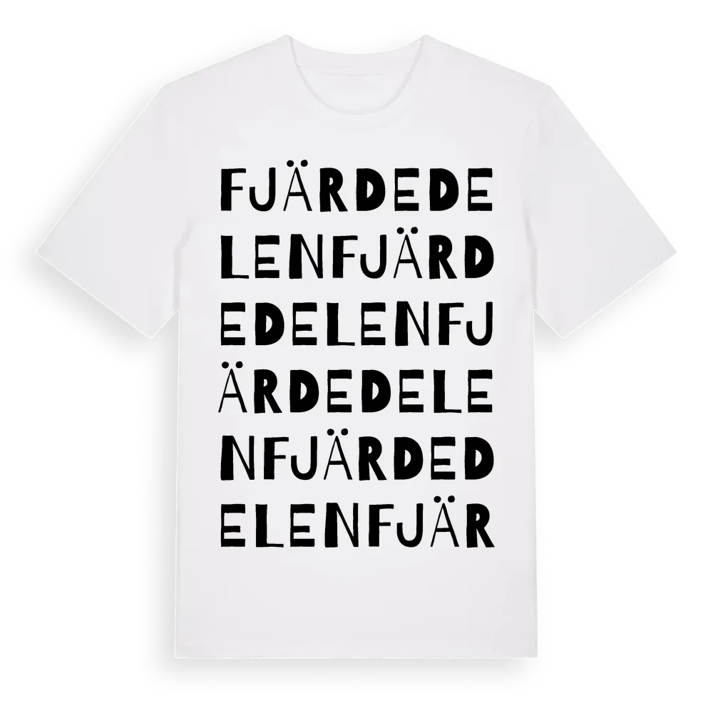 Fjärdedelen ordlek t-shirt är inspirerad av Fjärdedelen i Östergötlands län, Sverige. Tröjan är designad för dig som har en speciell koppling till platsen – oavsett om du bor här, har rötterna här eller bara älskar Fjärdedelen.