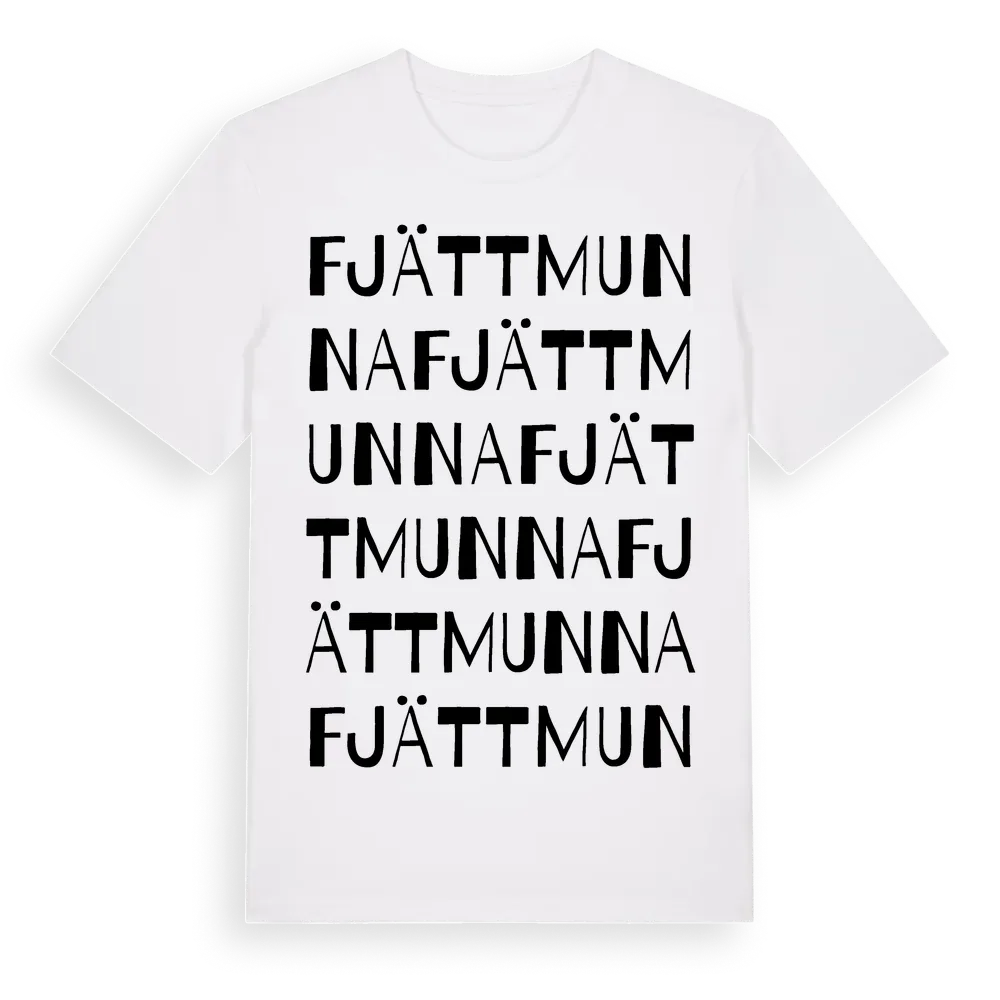 Fjättmunna ordlek t-shirt är inspirerad av byn Fjättmunna i Östergötlands län, Sverige. Tröjan är designad för dig som har en speciell koppling till platsen – oavsett om du bor här, har rötterna här eller bara älskar Fjättmunna.