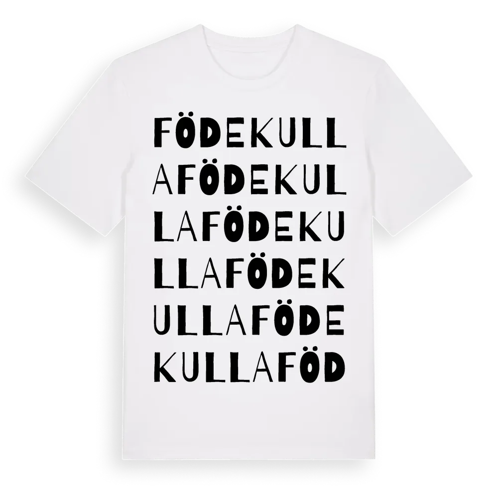 Födekulla ordlek t-shirt är inspirerad av byn Födekulla i Östergötlands län, Sverige. Tröjan är designad för dig som har en speciell koppling till platsen – oavsett om du bor här, har rötterna här eller bara älskar Födekulla.