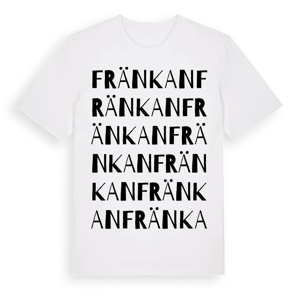 Fränkan ordlek t-shirt är inspirerad av Fränkan i Östergötlands län, Sverige. Tröjan är designad för dig som har en speciell koppling till platsen – oavsett om du bor här, har rötterna här eller bara älskar Fränkan.