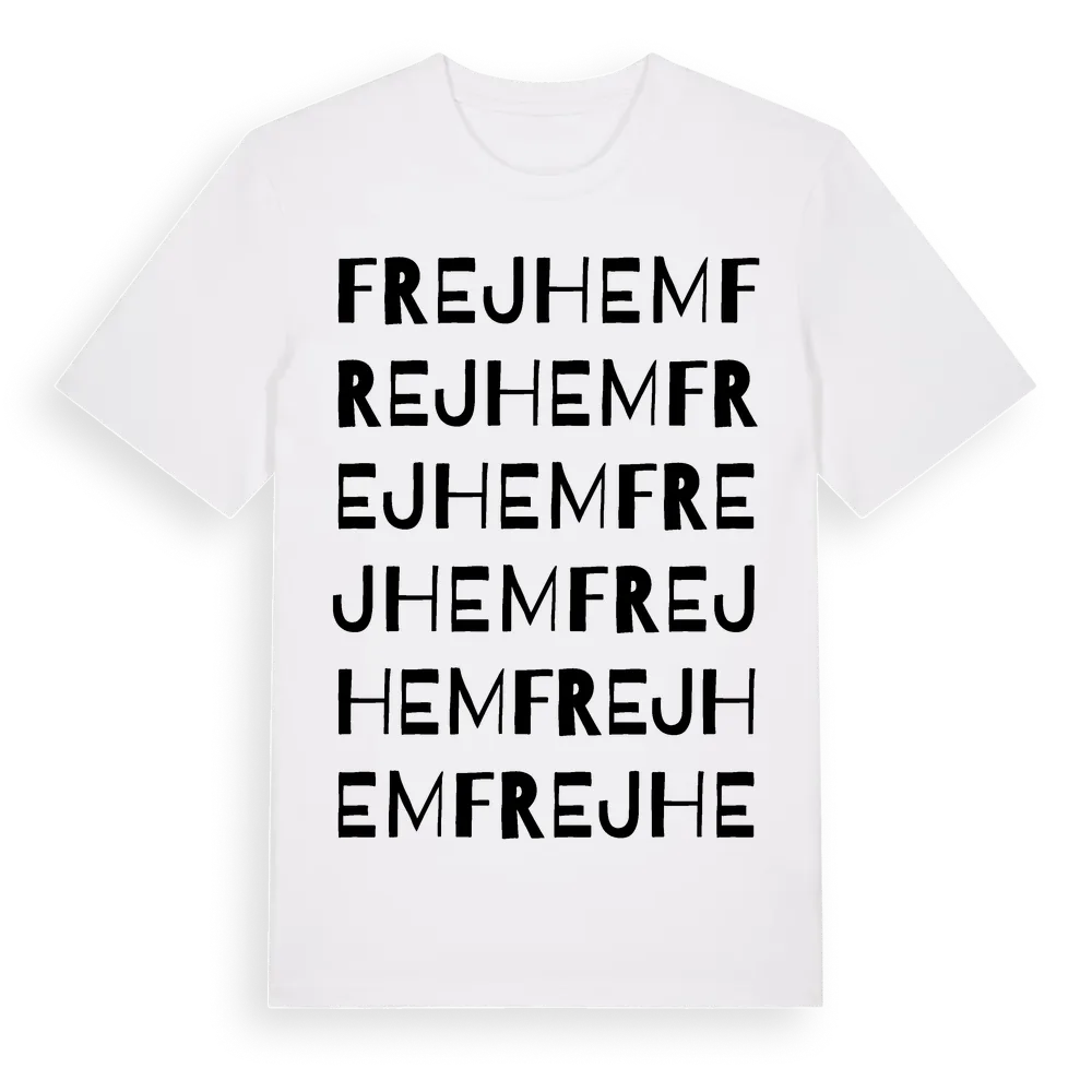 Frejhem ordlek t-shirt är inspirerad av Frejhem i Östergötlands län, Sverige. Tröjan är designad för dig som har en speciell koppling till platsen – oavsett om du bor här, har rötterna här eller bara älskar Frejhem.