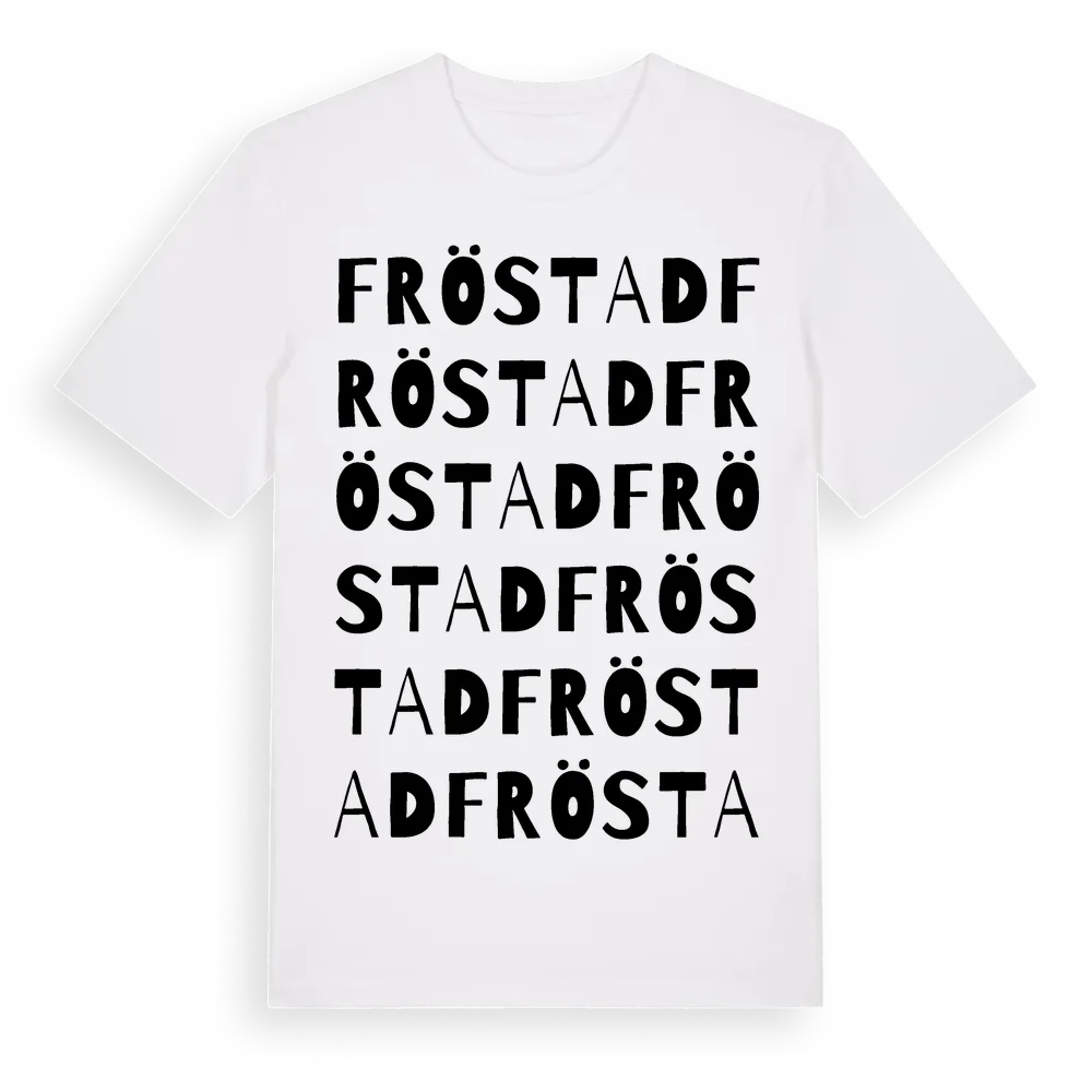 Fröstad ordlek t-shirt är inspirerad av byn Fröstad i Östergötlands län, Sverige. Tröjan är designad för dig som har en speciell koppling till platsen – oavsett om du bor här, har rötterna här eller bara älskar Fröstad.