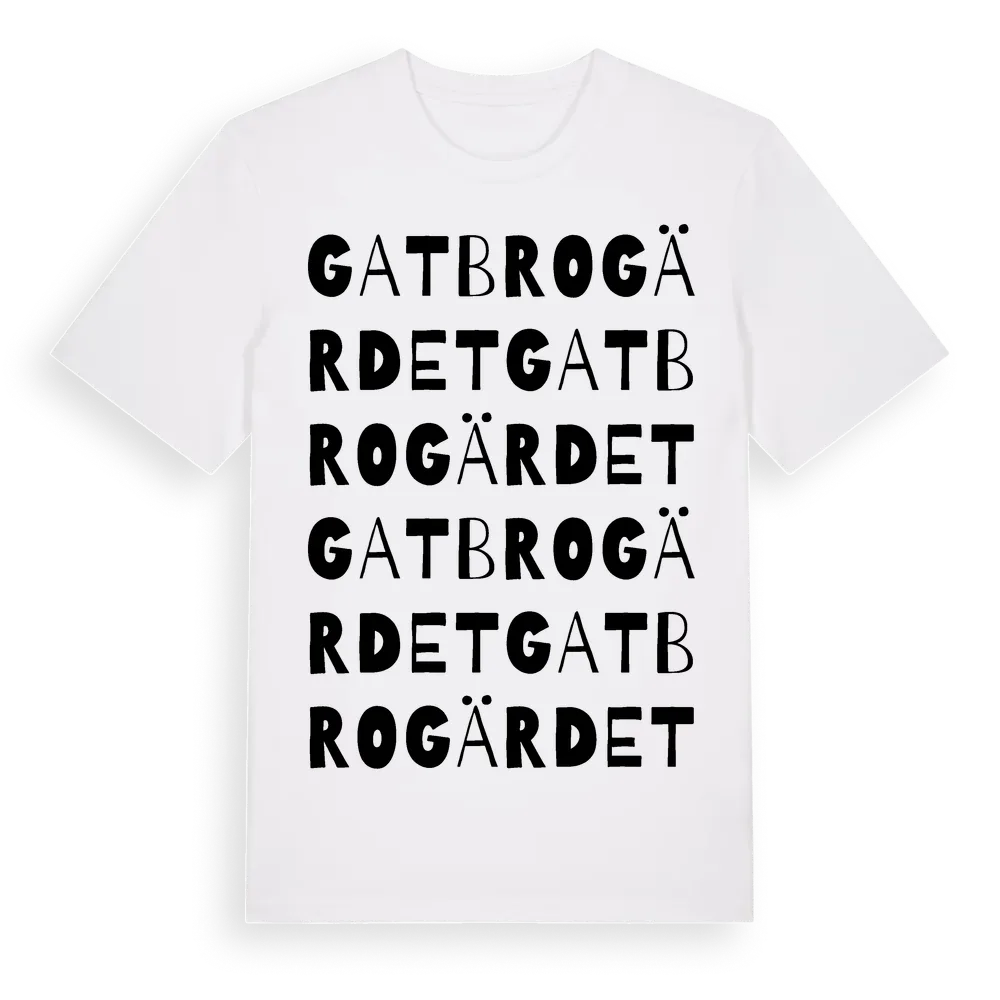 Gatbrogärdet ordlek t-shirt är inspirerad av Gatbrogärdet i Östergötlands län, Sverige. Tröjan är designad för dig som har en speciell koppling till platsen – oavsett om du bor här, har rötterna här eller bara älskar Gatbrogärdet.
