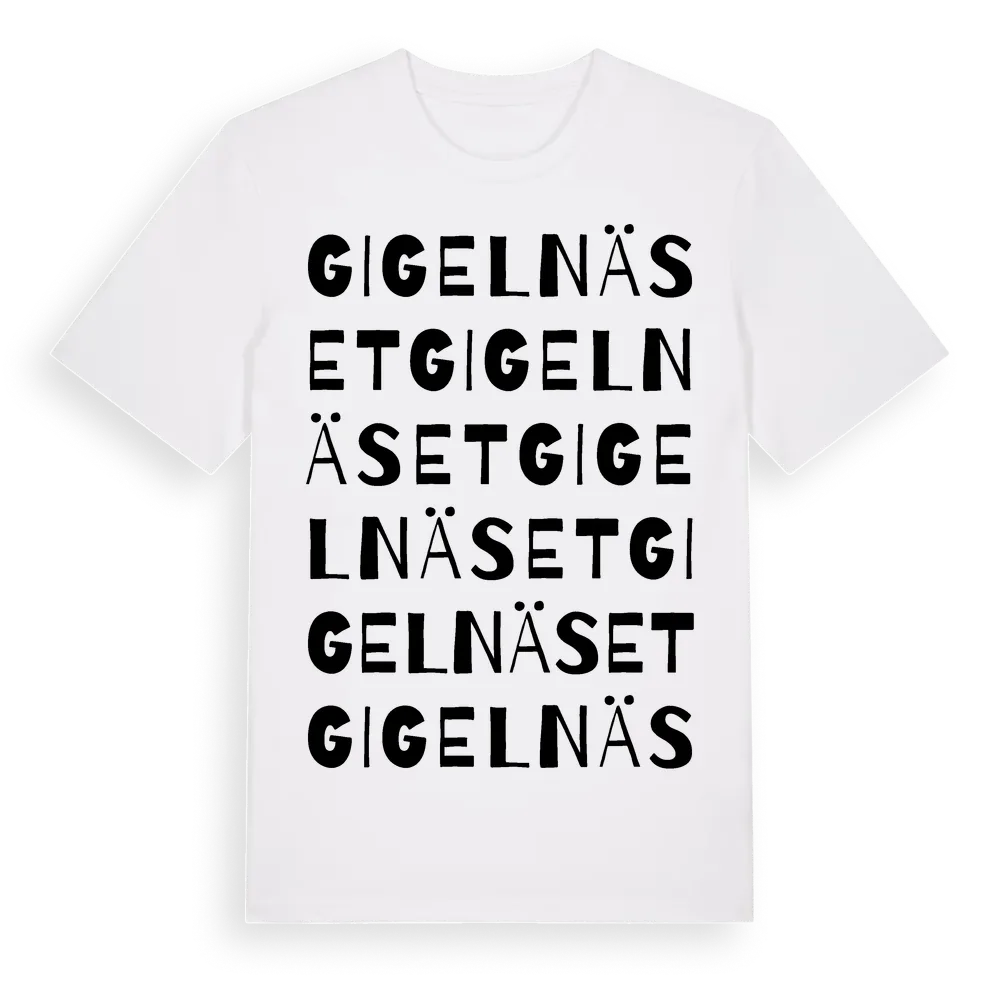 Gigelnäset ordlek t-shirt är inspirerad av Gigelnäset i Östergötlands län, Sverige. Tröjan är designad för dig som har en speciell koppling till platsen – oavsett om du bor här, har rötterna här eller bara älskar Gigelnäset.