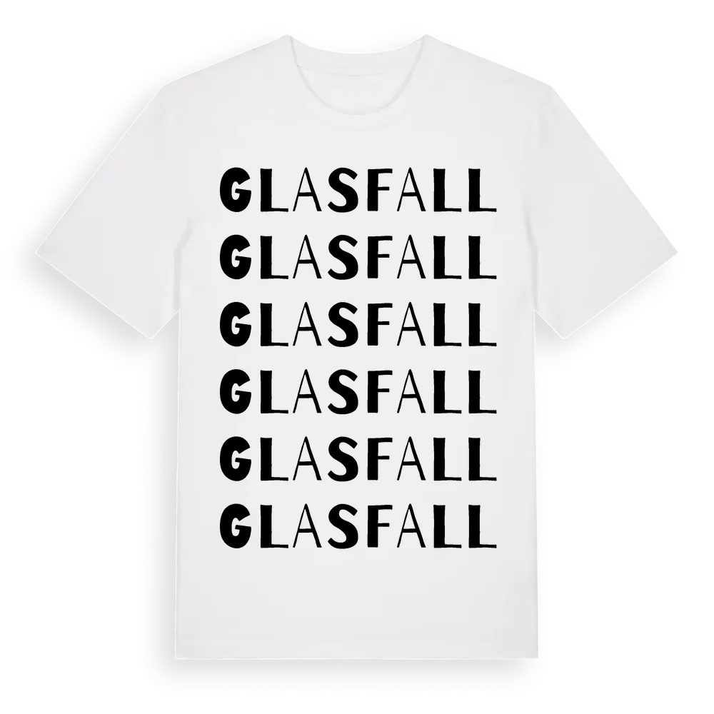 En ordlek byggd på Glasfalls namn. Subtilt och klurig – ett motiv som bara de som verkligen känner platsen fullt ut förstår. Premium bomull, unisex – från byn Glasfall i Östergötlands län.
