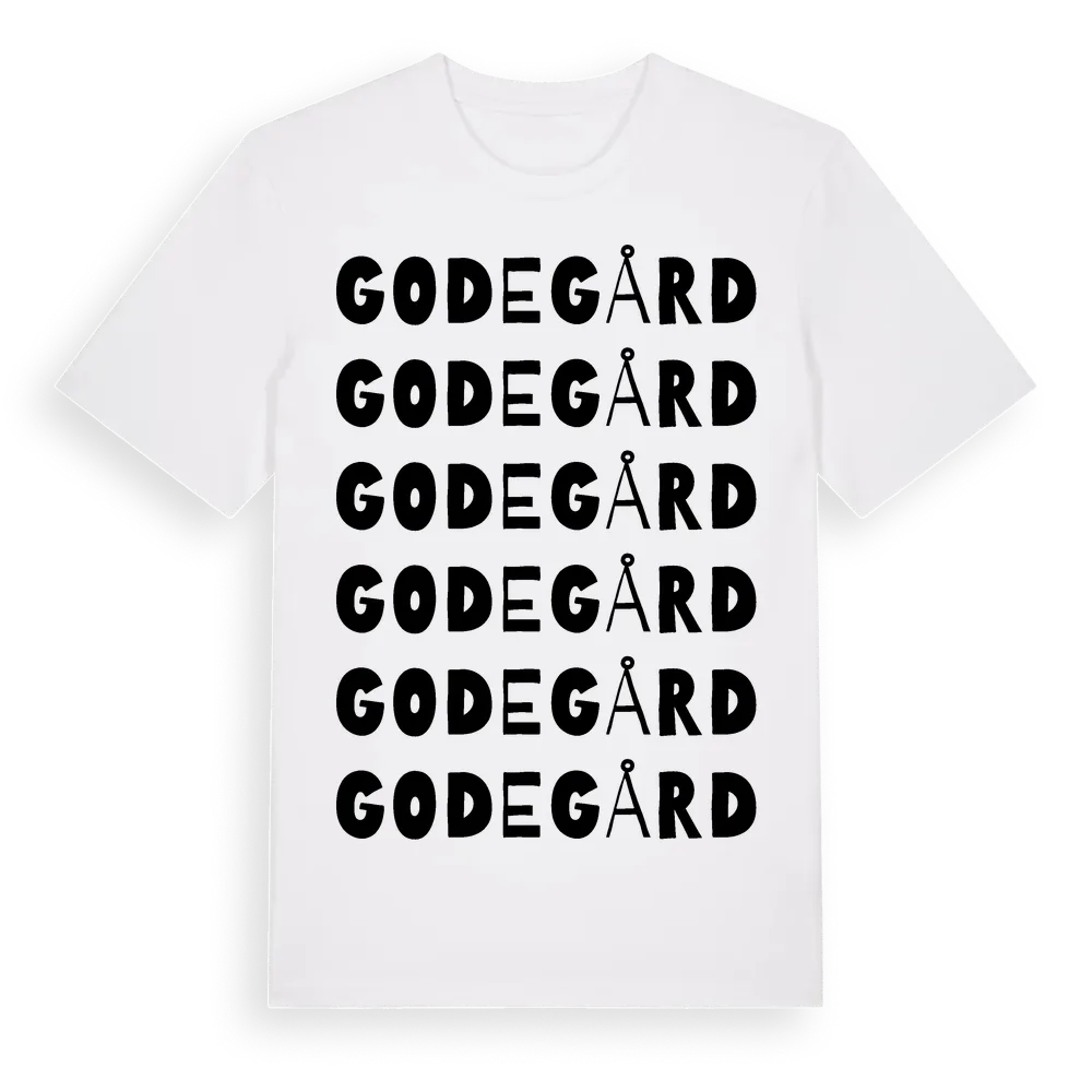 Godegård ordlek t-shirt är inspirerad av byn Godegård i Östergötlands län, Sverige. Tröjan är designad för dig som har en speciell koppling till platsen – oavsett om du bor här, har rötterna här eller bara älskar Godegård.