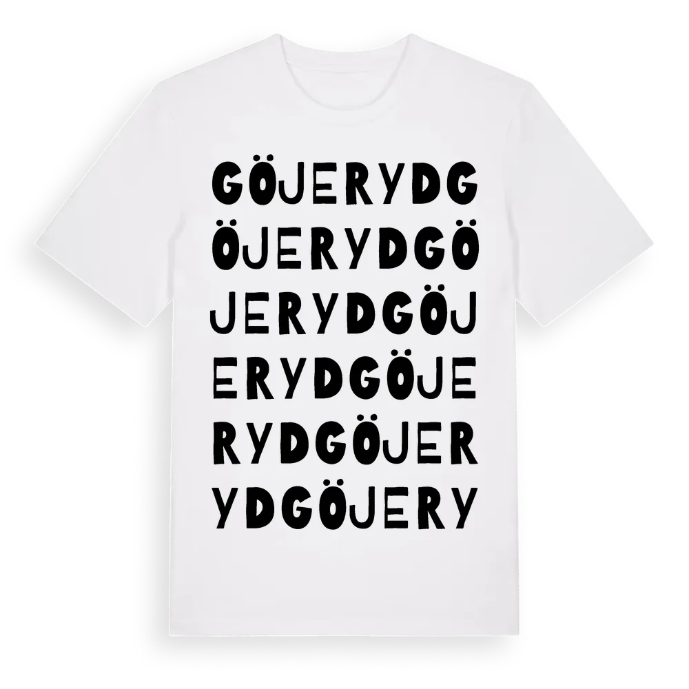 Göjeryd ordlek t-shirt är inspirerad av byn Göjeryd i Östergötlands län, Sverige. Tröjan är designad för dig som har en speciell koppling till platsen – oavsett om du bor här, har rötterna här eller bara älskar Göjeryd.