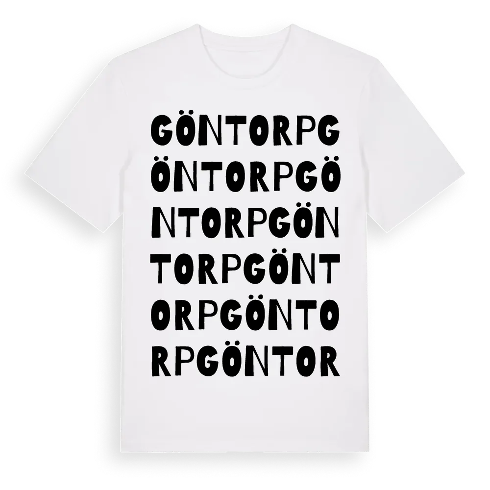 Göntorp ordlek t-shirt är inspirerad av byn Göntorp i Östergötlands län, Sverige. Tröjan är designad för dig som har en speciell koppling till platsen – oavsett om du bor här, har rötterna här eller bara älskar Göntorp.