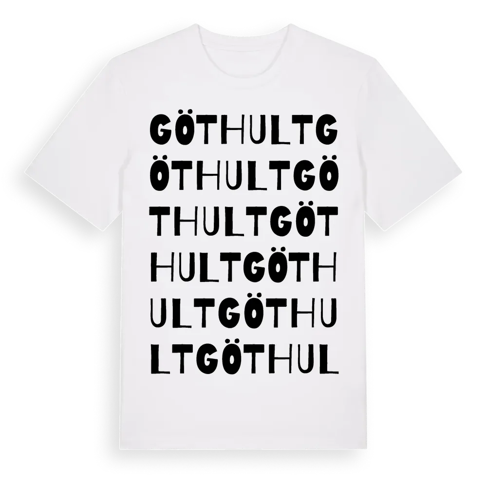 Göthult ordlek t-shirt är inspirerad av byn Göthult i Östergötlands län, Sverige. Tröjan är designad för dig som har en speciell koppling till platsen – oavsett om du bor här, har rötterna här eller bara älskar Göthult.