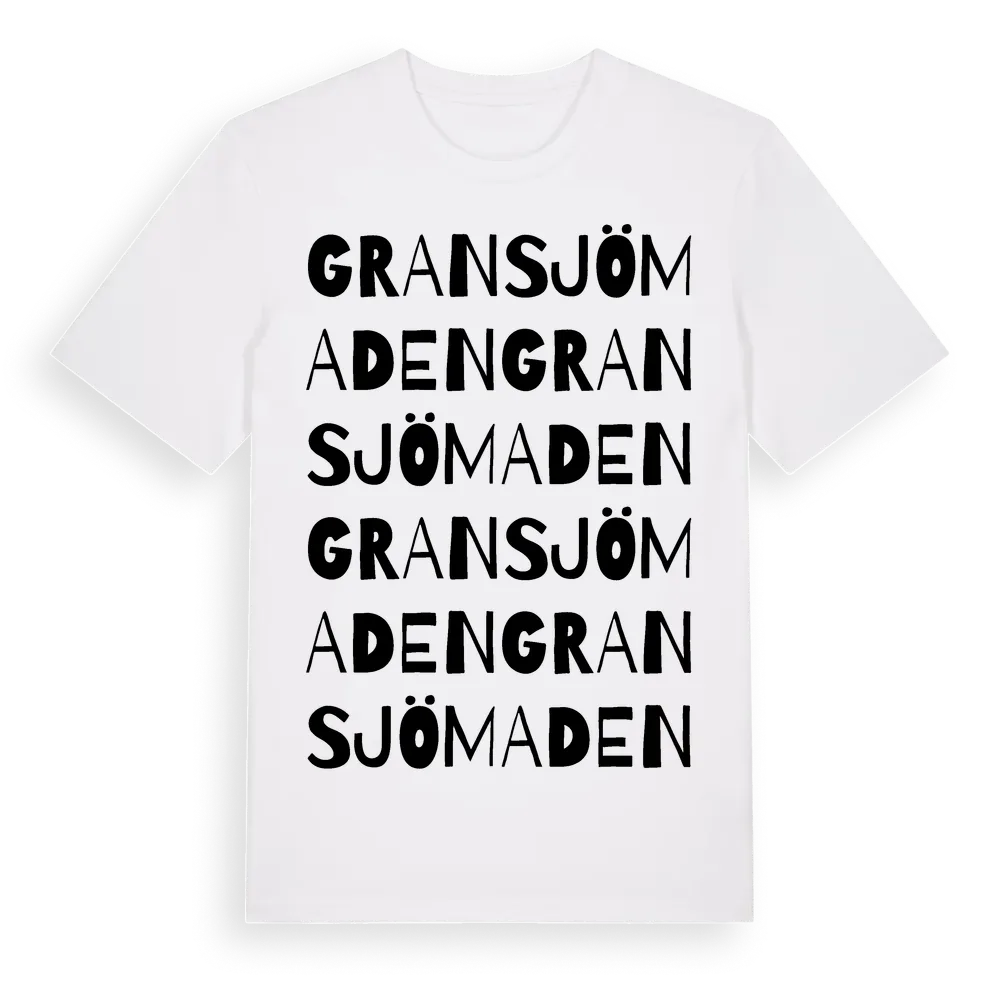 Gransjömaden ordlek t-shirt är inspirerad av Gransjömaden i Östergötlands län, Sverige. Tröjan är designad för dig som har en speciell koppling till platsen – oavsett om du bor här, har rötterna här eller bara älskar Gransjömaden.