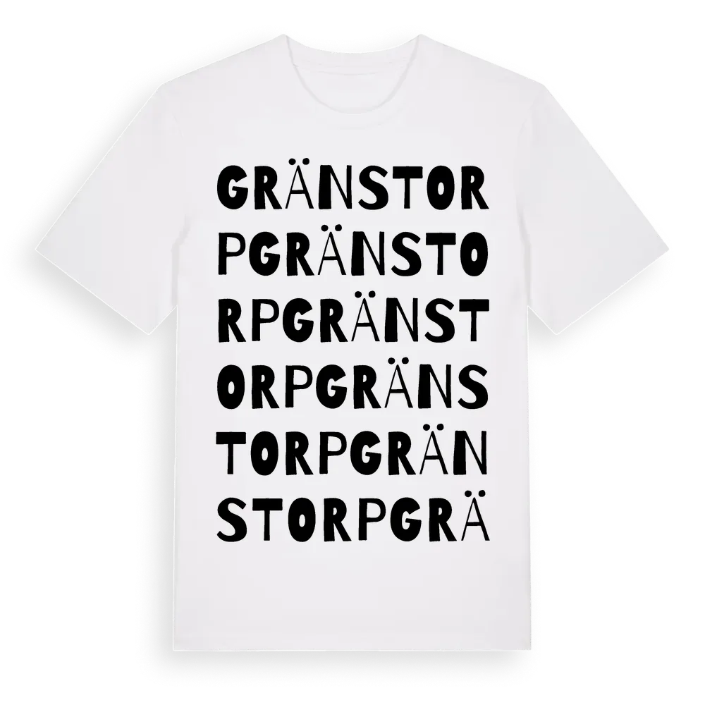 Gränstorp ordlek t-shirt är inspirerad av Gränstorp i Östergötlands län, Sverige. Tröjan är designad för dig som har en speciell koppling till platsen – oavsett om du bor här, har rötterna här eller bara älskar Gränstorp.