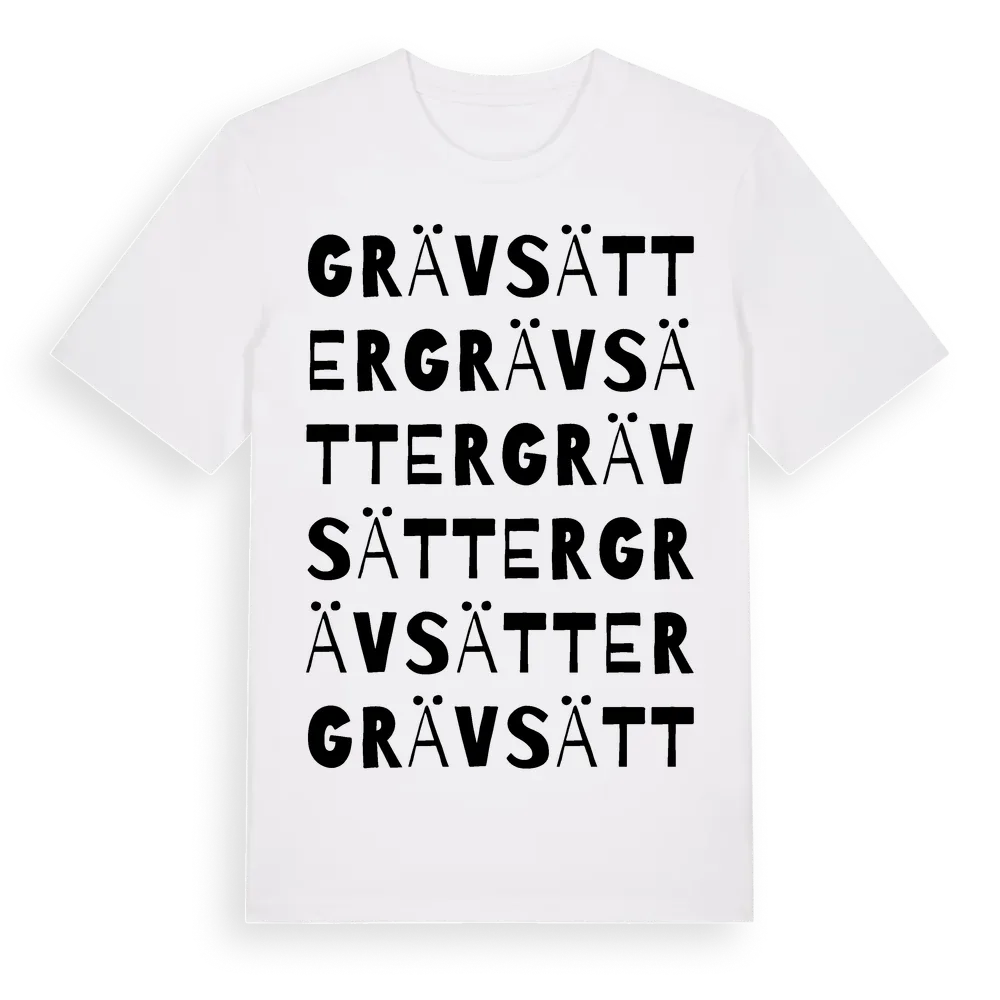 Grävsätter ordlek t-shirt är inspirerad av Grävsätter i Östergötlands län, Sverige. Tröjan är designad för dig som har en speciell koppling till platsen – oavsett om du bor här, har rötterna här eller bara älskar Grävsätter.