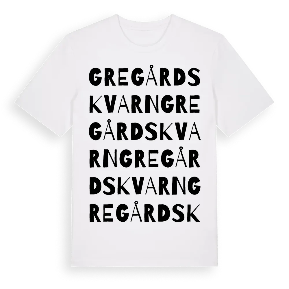Gregårdskvarn ordlek t-shirt är inspirerad av Gregårdskvarn i Östergötlands län, Sverige. Tröjan är designad för dig som har en speciell koppling till platsen – oavsett om du bor här, har rötterna här eller bara älskar Gregårdskvarn.