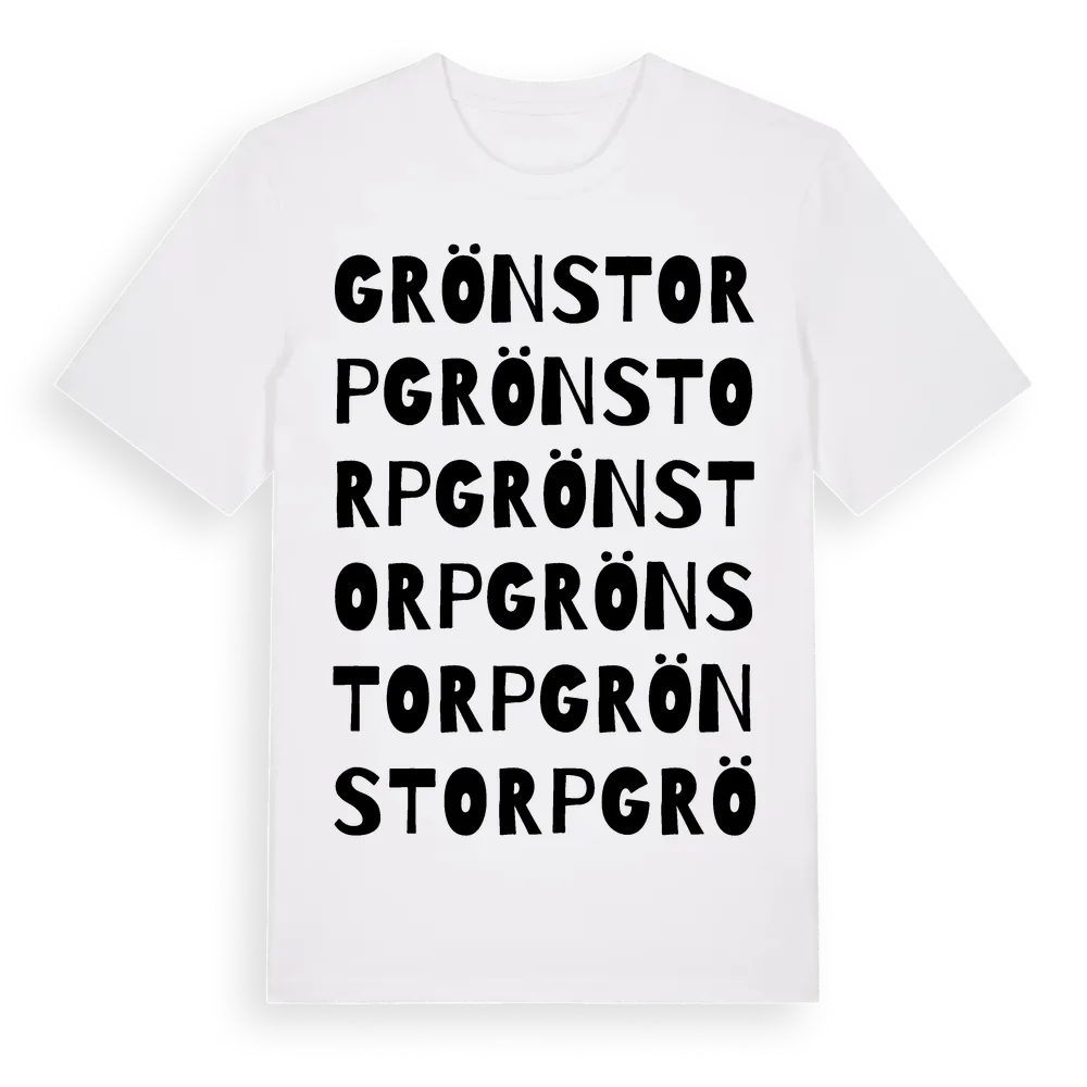 Grönstorp ordlek t-shirt är inspirerad av byn Grönstorp i Östergötlands län, Sverige. Tröjan är designad för dig som har en speciell koppling till platsen – oavsett om du bor här, har rötterna här eller bara älskar Grönstorp.