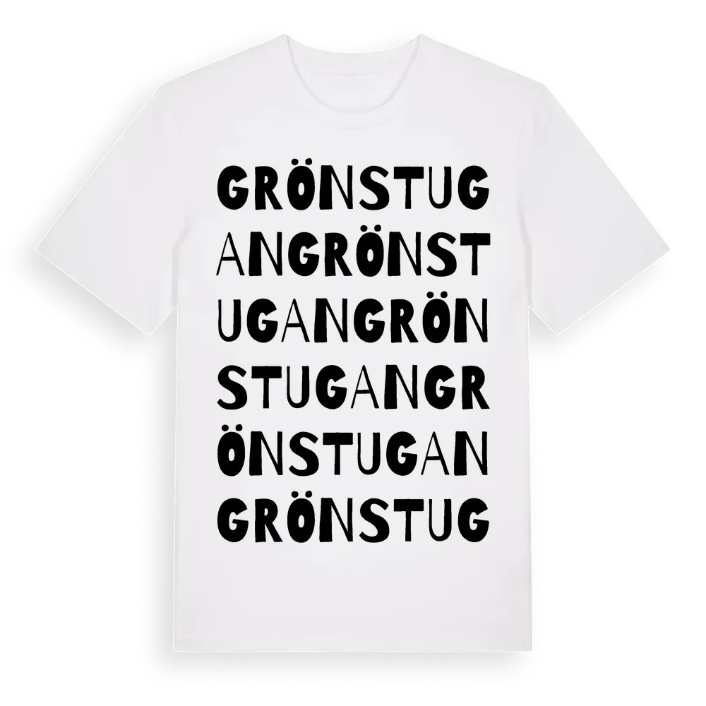 Grönstugan ordlek t-shirt är inspirerad av byn Grönstugan i Östergötlands län, Sverige. Tröjan är designad för dig som har en speciell koppling till platsen – oavsett om du bor här, har rötterna här eller bara älskar Grönstugan.