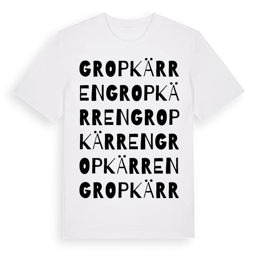 Gropkärren ordlek t-shirt är inspirerad av Gropkärren i Östergötlands län, Sverige. Tröjan är designad för dig som har en speciell koppling till platsen – oavsett om du bor här, har rötterna här eller bara älskar Gropkärren.